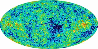 a "baby picture" of the universe. Colors indicate "warmer" (red) and "cooler" (blue) spots. The oval shape is a projection to display the