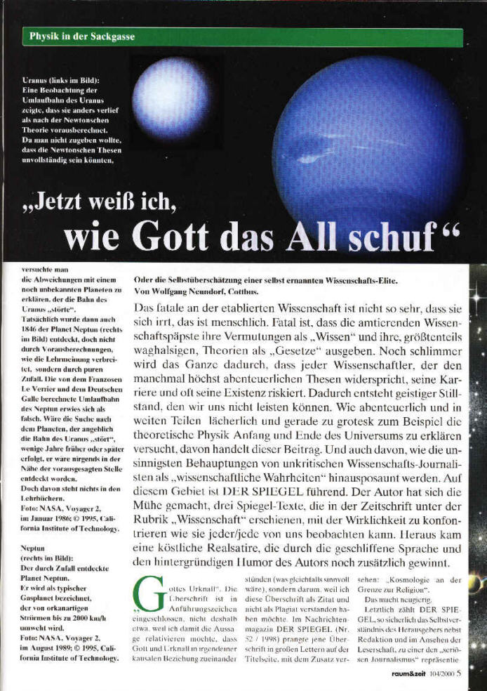 (Nr. 52 / 1998) prangte jene Überschrift in großen Lettern auf der Titelseite, mit dem Zusatz versehen: „Kosmologie an der Grenze zur Religion“.